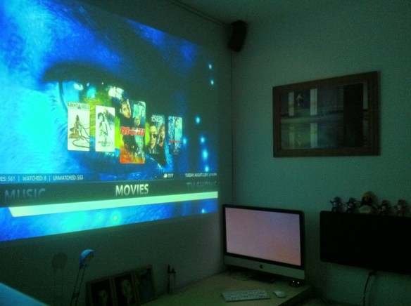Setting up a used projector as a third monitor is a success! Shown here running XBMC on OS X. Look how tiny the 27″ and 23″ monitors look. :)
